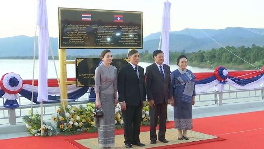 จากนั้น พระบาทสมเด็จพระเจ้าอยู่หัว และสมเด็จพระนางเจ้า ฯ พระบรมราชินี ทรงเปิดสะพานมิตรภาพไทย-ลาว แห่งที่ 5 พร้อมด้วย ประธานประเทศแห่งสาธาธารณรัฐประชาธิปไตยประชาชนลาว และภริยา ซึ่งจัดสร้างขึ้น เนื่องจากราชอาณาจักรไทย และสาธารณรัฐประชาธิปไตยประชาชนลาว มีความสัมพันธ์อันดีกันมายาวนาน โดยจะมีความสัมพันธ์ทางการทูตครบ 75 ปี ในเดือนธันวาคมนี้ รวมทั้งทั้งสองประเทศมีการเชื่อมโยงด้านการคมนาคมขนส่งสินค้า และการผ่านแดนของประชาชนผ่านเส้นทางแม่น้ำโขงเป็นหลัก จึงมีการก่อสร้างสะพานขนาดใหญ่เชื่อมโยงสองประเทศหลายแห่ง สามารถสนับสนุนการท่องเที่ยว การค้าการลงทุน ส่งเสริมสภาพเศรษฐกิจและสังคม ให้แก่ประชาชนทั้งสองประเทศเป็นอย่างดี