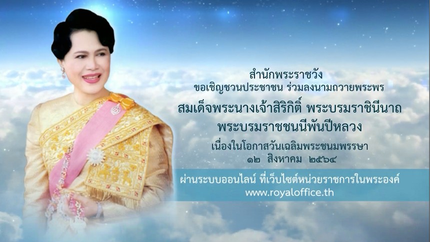 เนื่องในโอกาส วันเฉลิมพระชนมพรรษา ของสมเด็จพระนางเจ้าสิริกิติ์ พระบรมราชินีนาถ พระบรมราชชนนีพันปีหลวง วันที่ 12 สิงหาคม 2564 สำนักพระราชวัง ขอเชิญชวนประชาชน ร่วมลงนามถวายพระพร สมเด็จพระนางเจ้าสิริกิติ์ พระบรมราชินีนาถ พระบรมราชชนนีพันปีหลวง ผ่านระบบออนไลน์ ที่เว็บไซต์หน่วยราชการในพระองค์ www.royaloffice.th ระหว่างวันที่ 7 ถึง 13 สิงหาคม 2564