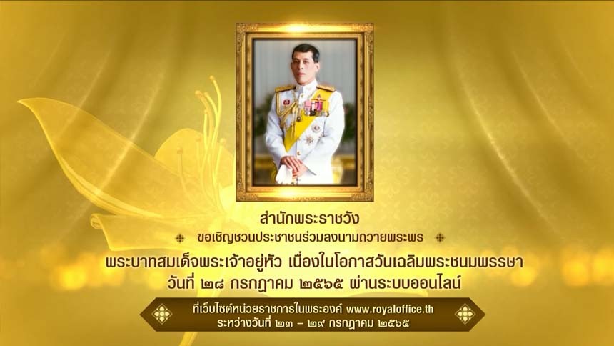 เนื่องในโอกาสวันเฉลิมพระชนมพรรษา พระบาทสมเด็จพระเจ้าอยู่หัว วันที่ 28 กรกฎาคม 2565 สำนักพระราชวัง ขอเชิญชวนประชาชน ร่วมลงนามถวายพระพร พระบาทสมเด็จพระเจ้าอยู่หัว ผ่านระบบออนไลน์ ที่เว็บไซต์หน่วยราชการในพระองค์ www.royaloffice.th ระหว่างวันที่ 23 – 29 กรกฎาคม 2565