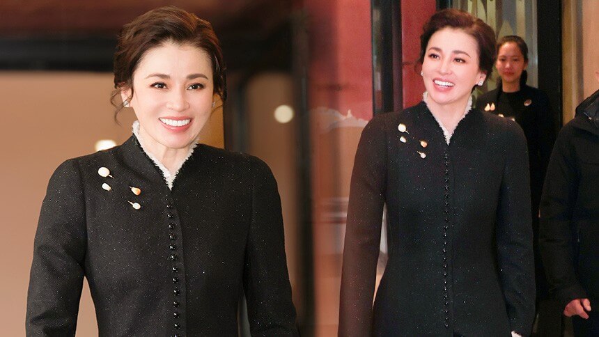 "กระเป๋าทรง" หนังวัวสีดำ ฉลองพระบาทบูทข้อเท้าสีดำ เครื่องประดับเป็นโอปอลคู่ทรงรี สำหรับกลัดช่วงอก (Jabot Pins) ตัวเรือนทอง แหวนอะพาไทต์ตาแมวล้อมเพชร ตัวเรือนทอง โทนอ่อนตัดกับสีดำ