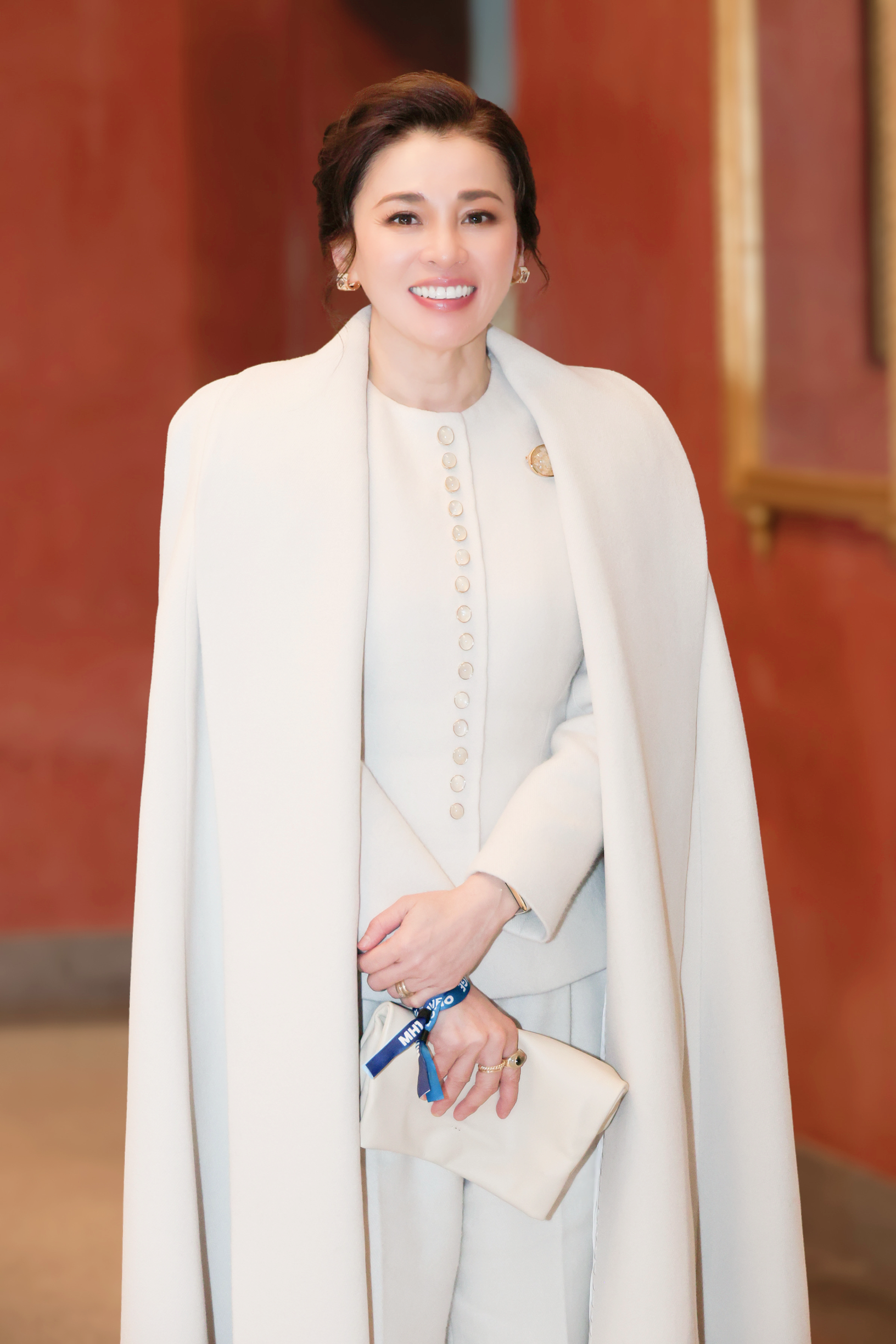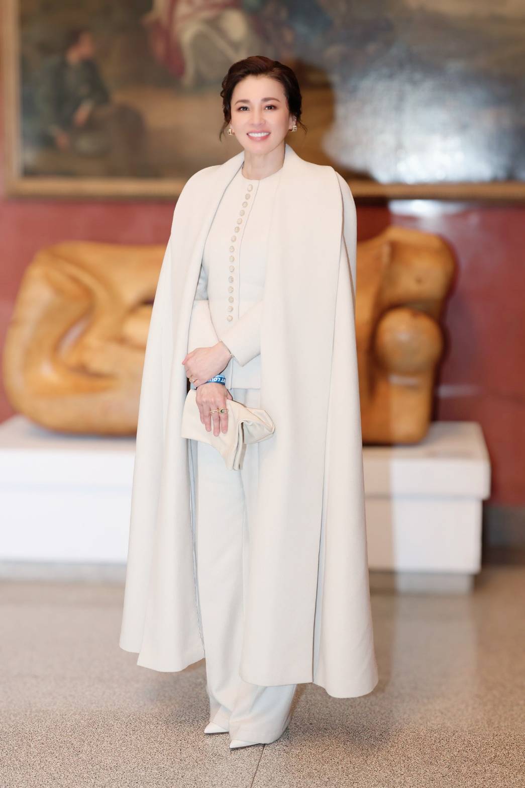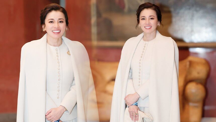 โดยฉลองพระองค์ที่ทรงระหว่างทอดพระเนตรการแข่งขันฯ คือ ฉลองพระองค์แจ็กเก็ตแขนยาวสีขาวนวล (Cloud Dancer) คอกลม ผ้าวูล พระดุมหินควอตซ์ (Quartz)ฐานเงิน ใส่คู่กับพระสนับเพลาทรงตรง (Cigarette) สีเดียวกัน สวมคลุมด้วยเคปยาว ตัดเย็บด้วยผ้าวูลเนื้อเดียวกัน โครงทรงตรงปกในตัว พระกระเป๋าหนังสีครีมประดับเงิน และฉลองพระบาทบูทเรียบสีครีมเครื่องประดับเป็นเข็มกลัดโป่งข่ามคู่ (Lodolite Quartz) ตัวเรือนทอง ติดบริเวณอกด้านซ้าย โทนใสตัดกับสีขาวนวล