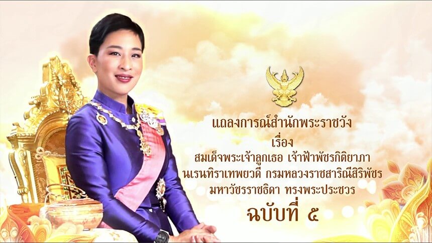 แถลงการณ์สำนักพระราชวัง เรื่อง สมเด็จพระเจ้าลูกเธอ เจ้าฟ้าพัชรกิติยาภา นเรนทิราเทพยวดี กรมหลวงราชสาริณีสิริพัชร มหาวัชรราชธิดา ฉบับที่ 5