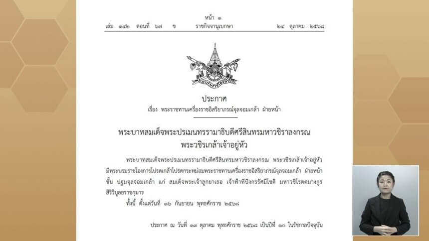 วันที่ 24 ตุลาคม 2568 เว็บไซต์ราชกิจจานุเบกษา เผยแพร่ประกาศเรื่อง “พระราชทานเครื่องราชอิสริยาภรณ์จุลจอมเกล้า ฝ่ายหน้า” ระบุว่า