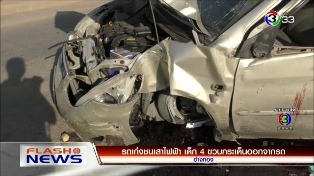 เกิดเหตุรถเก๋งเสียหลัก ปีนขึ้นเกาะกลางถนน ชนเสาไฟฟ้า พบเด็กชายอายุ 4 ปี กระเด็นออกนอกตัวรถ ได้รับบาดเจ็บสาหัส ภายในรถมีผู้บาดเจ็บติดอยู่ 2 ราย บริเวณถนนสายอยุทยา - อ่างทอง สอบสวนชายคนขับระบุ ขับมาพร้อม ภรรยากับลูกน้อย พ่อถึงจุดเกิดเหตุเด็กเอื้อมมือมาดึงพวงมาลัยรถ จนทำให้รถเสียหลัก