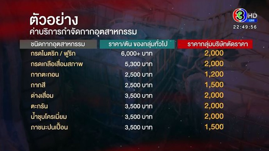 ตัวอย่างชนิดกาก และราคานี้ข่าว 3 มิติ ได้มาจากหลายบริษัทกิจการรับกำจัดกากอุตสาหกรรมที่ต้องจ่ายในราคาปกติ เปรียบเทียบกับบางกลุ่มบริษัท ที่รับมาในราคาที่ถูกกว่า หรือเรียกว่าตัดราคา เช่นกรดไนตริก ตันละ 2 พันบาท/กรดเกลือเสื่อมสภาพตันละ 2 พัน/กากตะกอน ตันละ 1,200 /กากสีตันละ1500/ด่างเสื่อมสภาพตันละ 2,000 ตะกรัน ตันละ 2,000 น้ำชุบโครเมี่ยมตันละ 2,000 และภาชนะปนเปื้อนตันละ 1,500