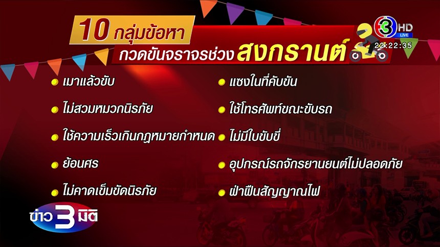 ส่วนการตั้งด่านตามถนนเน้นจับ 10 กลุ่มข้อหา คือ เมาแล้วขับ ไม่สวมหมวกนิรภัย ใช้ความเร็วเกินกฎหมายกำหนด ย้อนศร ไม่คาดเข็มขัดนิรภัย แซงในที่คับขัน ใช้โทรศัพท์ขณะขับรถ ไม่มีใบขับขี่ อุปกรณ์รถจักรยานยนต์ไม่ปลอดภัย และฝ่าฝืนสัญญาณไฟ