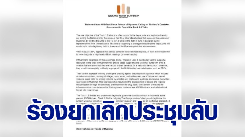 ภาคประชาสังคมเมียนมาและไทย 546 องค์กร มีจดหมายเปิดผนึกด่วน ประณามการประชุมลับ ที่นายดอน ปรมัตถุ์วินัย รองนายกรัฐมนตรีและรัฐมนตรีว่าการกระทรวงการต่างประเทศ เชิญรัฐมนตรีต่างประเทศอาเซียน เข้าร่วมการประชุมอย่างไม่เป็นทางการที่ประเทศไทย ในวันที่ 18-19 มิถุนายน จึงเรียกร้องให้รัฐบาลรักษาการของไทย ยกเลิกการประชุมโดยทันที เพราะถือเป็นการดูหมิ่นอย่างสิ้นเชิงต่อประชาชนชาวเมียนมา และขัดแย้งอย่างสิ้นเชิงกับฉันทามติของอาเซียน และไม่ได้เกิดจากความตกลงของรัฐภาคีอาเซียน รวมทั้งรัฐบาลอินโดนีเซีย ในฐานะประธานอาเซียน ในการจัดการประชุมครั้งนี้