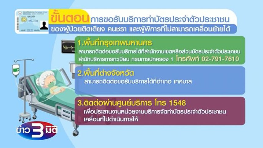 2.บัตรประชาชนของผู้ป่วย คนชรา เเละคนพิการที่ไม่สามารถเคลื่อนย้ายได้ ถ้ามีให้ติดไปด้วย เเละ