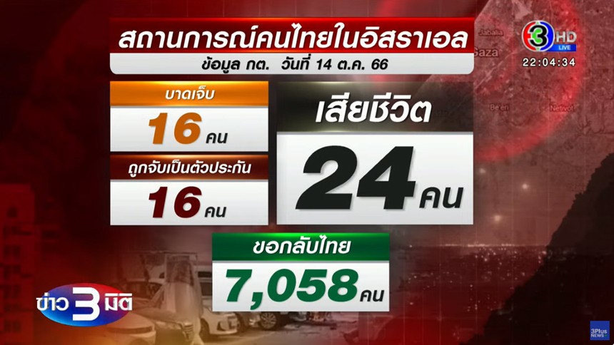 ล่าสุด มีคนไทยเสียชีวิตเพิ่มอีก 3 คน รวมเป็น 24 คน บาดเจ็บเพิ่มอีก 2 คน รวม 16 คน และถูกจับเป็นตัวประกันคงเดิม 16 คน ขณะที่ตัวเลขคนไทยแจ้งขอกลับประเทศอยู่ที่ 7,058 คน