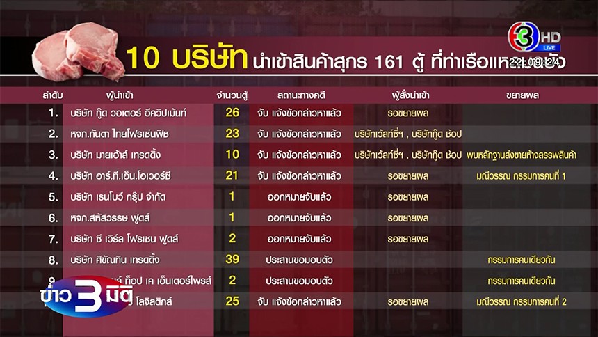 บริษัทผู้นำเข้าสินค้าในเอกสารที่ข่าว 3มิติได้มานี้ เป็นหนึ่งใน 10 บริษัทที่ร่วมกันนำเข้าหมูเถื่อน 161 ตู้ ซึ่งทั้งกรรมการผู้มีอำนาจลงนาม 10 บริษัทดังกล่าว ถูกจับได้แล้ว 5 บริษัท ถูกออกหมายจับและอยู่ระหว่างติดตามตัว 3 บริษัท และอีก 2 บริษัท ประสานเข้ามอบตัวแล้ว