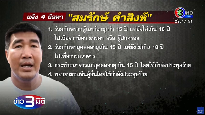 จากนั้น พ.ต.อ.ยศวัจน์ ให้สัมภาษณ์ว่า คณะพนักงานสอบสวนมีมติร่วมกันในการแจ้งข้อกล่าวหานายสมรักษ์ คำสิงห์ โดยพิจารณาคำกล่าวหาของผู้กล่าวหาและผู้เสียหายแล้ว 4 ข้อหา ประกอบด้วย ร่วมกันพรากผู้เยาว์อายุกว่า 15 ปี แต่ยังไม่เกิน 18 ปี ไปเสียจากบิดา มารดา หรือ ผู้ปกครอง /ร่วมกันพาบุคคลอายุเกิน 15 ปี แต่ยังไม่เกิน 18 ปี ไปเพื่อการอนาจาร /กระทำอนาจารแก่บุคคลอายุเกิน 15 ปี โดยใช้กำลังประทุษร้ายและพยายามข่มขืนผู้อื่นโดยใช้กำลังประทุษร้าย