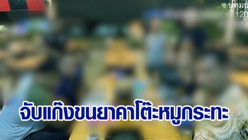 ขณะที่คืนเดียวกัน ตำรวจกองบังคับการสกัดกั้นและลำเลียงยาเสพติด บุกเข้าจับกุม ผู้ต้องหาได้ 6 ราย ขณะนั่งกินหมูกระทะร้านดัง ย่านปทุมธานี โดยจอดรถบรรทุกป้ายทะเบียนฉะเชิงเทราไว้ข้างทาง