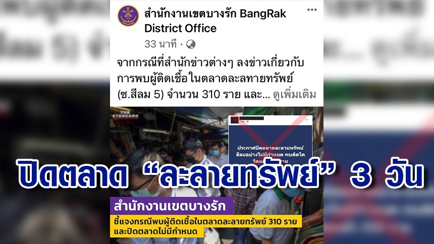 จากกรณีที่สำนักข่าวต่าง ๆ ลงข่าวเกี่ยวกับการพบผู้ติดเชื้อในตลาดละลายทรัพย์ (ซ.สีลม 5) จำนวน 310 ราย และทำการปิดตลาดไม่มีกำหนดนั้น ทางสำนักงานเขตบางรัก ขอชี้แจงว่าข่าวดังกล่าวไม่ได้เป็นความจริงแต่อย่างใด