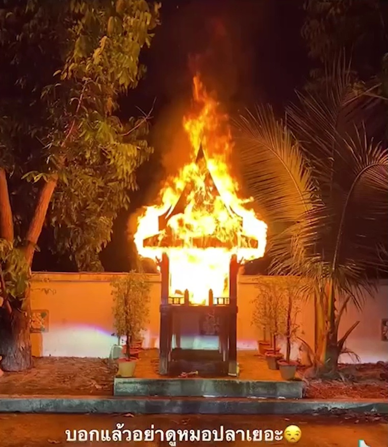 วันที่ 19 ก.พ.65 กรณีนายนิกร ทองฟู อายุ 40 ปี ลงมือจุดไฟเผาศาลพระภูมิทรงเรือนไทย ของตัวเองจนวอดทั้งหลัง โดยมี น.ส.เบนโจ วิสายอน อายุ 27 ปี ญาติเจ้าของศาลถ่ายคลิปแล้วเอาไปลงใน Tik Tok