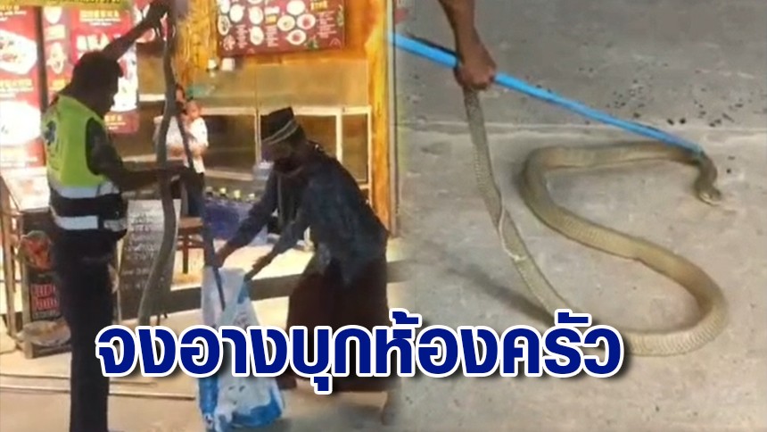 วิ่งกระเจิง! งูจงอางยาว 4 เมตร บุกห้องครัวร้านอาหาร ร้องกู้ภัยช่วยจับ