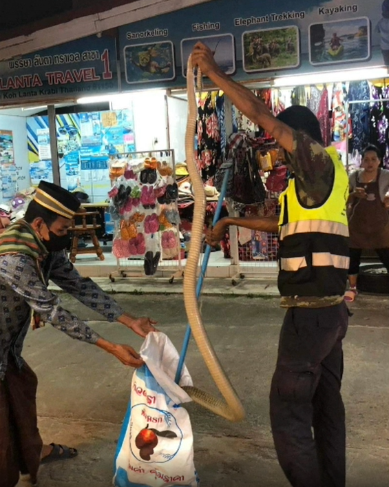 สอบถามทีมกู้ภัย ทราบว่า งูจงอางตัวดังกล่าว เชฟพบเลื้อยอยู่ในห้องครัว ซึ่งทางเชฟบอกว่า ตกใจอย่างมากเมื่อเห็น ได้วิ่งหนีออกมาทันที จากนั้นก็แจ้งกู้ภัยเข้าจับ คาดว่างูตัวดังกล่าวน่าจะตามจับสัตว์ จำพวกหนูเข้าไปในห้องครัว โชคดีมีคนเห็นเสียก่อน จึงแจ้งกู้ภัยเข้าช่วยจับ