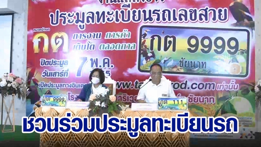 นางสาวชไมพร อำไพจิตร รองผู้ว่าราชการจังหวัดชัยนาท พร้อมด้วย นายชาตรี โรจรัตน์ ขนส่งจังหวัดชัยนาท ร่วมแถลงข่าวการจัดประมูลหมายเลขทะเบียนรถ เลขสวย หมวดอักษร กต (การงาน การค้า เติบโต ตลอดกาล) สำหรับรถยนต์นั่งส่วนบุคคลไม่เกินเจ็ดคน (รถเก๋ง รย.1) ครั้งที่ 5 จำนวน 301 หมายเลข เป็นภาพกราฟฟิค สีสันสวยงาม