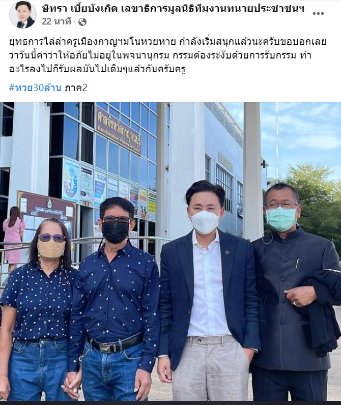 ล่าสุดดูเหมือนเรื่องราวจะยังไม่จบ เมื่อ “ทนายตั้ม ษิทรา” ได้โพสต์รูปภาพของ “ลุงจรูญ” พร้อมข้อความผ่านทางเฟซบุ๊ก ษิทรา เบี้ยบังเกิด เลขาธิการมูลนิธิทีมงานทนายประชาชนฯ ว่า “ยุทธการไล่ล่าครูเมืองกาญฯมโนหวยหาย กำลังเริ่มสนุกแล้วนะครับขอบอกเลยว่าวันนี้คำว่าให้อภัยไม่อยู่ในพจนานุกรม กรรมต้องระงับด้วยการรับกรรม ทำอะไรลงไปก็รับผลมันไปเต็มๆ แล้วกันครับครู หวย30ล้าน ภาค2”
