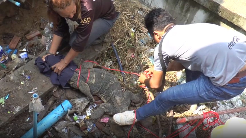 ทางด้าน นางสาว รฐา เจ้าหน้าที่กู้ภัยที่มาเพียงคนเดียว ทำการวางแผนอยู่นาน ไม่รู้จะเข้าไปจับตัวได้อย่างไร เนื่องจากมันตัวใหญ่มาก และมีอาการดุร้าย ท่ามกลางการยืนลุ้นดูของชาวบ้านร้านค้าที่มาดูการจับตัวเงินตัวทองขนาดใหญ่ ก่อนมีชาวบ้านเป็นชายหนุ่ม 2 คน เข้ามาช่วยด้วยการทำบ่วงคล้องคอไว้ แล้วทาง นางสาว รฐา ได้ใช้ผ้าคลุมหัวก่อนจับมัดขา แล้วอุ้มขึ้นแบกขึ้นบนบ่า