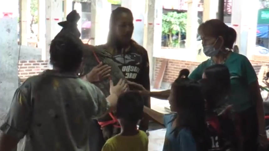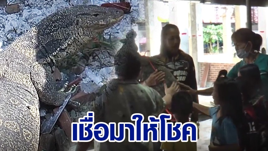ชาวบ้านไม่พลาดเข้ามารุมล้อมจับตัวเงินตัวทองตามความเชื่อว่าจะโชคดี และทำการถูหลังเพื่อส่องส่อหาตัวเลขกันอย่างคึกคัก