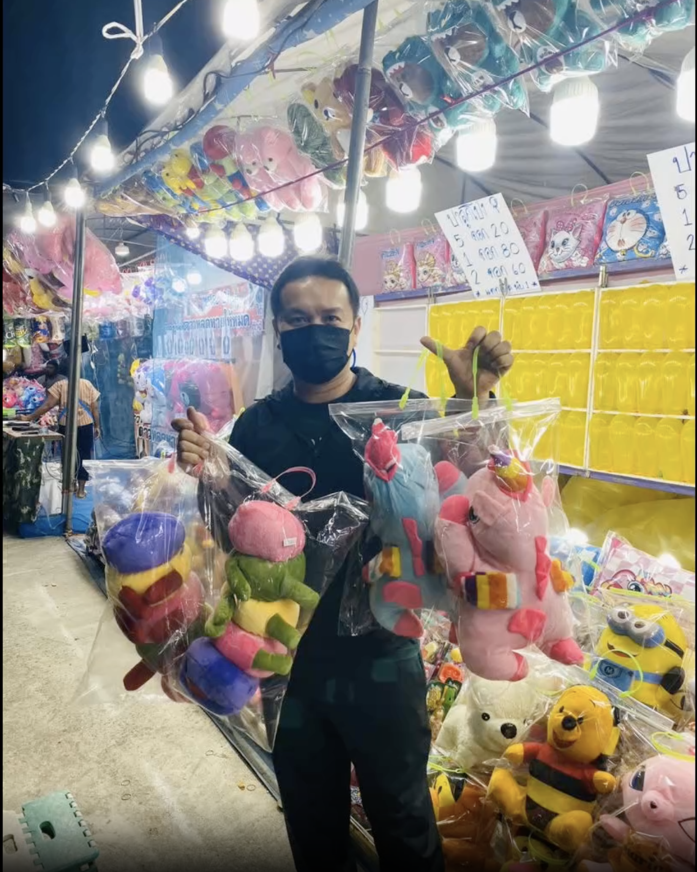 โดย นายอำนาจ เปิดเผยว่า ตุ๊กตาที่เห็นทั้งหมดได้มาจากการปาลูกโป่งตามงานประจำปีต่างๆ ซึ่งตนชอบเล่นปาโป่งมาก เมื่อก่อนเคยปาลูกโป่ง ในราคา 7 ดอก 20 บาท หากปาลูกโป่งแตกทั้งแถว(มีทั้งหมด 5 ลูก) จะสามารถเลือกตุ๊กตาขนาดใหญ่ได้ 1 ตัว ตนจึงลองปาเล่นตอนแรก ตนเองก็ปาลูกโป่ง ได้บ้างพลาดไปบ้าง แต่พอปาลูกโป่งบ่อยๆ เข้า รวมทั้งการเริ่มฝึกฝนก็เกิดความชำนาญ จนแทบจะไม่พลาดเลย เมื่อเห็นว่าตนปาได้ตุ๊กตาเยอะ ตอนหอบกลับบ้านก็มีคนมาขอซื้อ ตนจึงเห็นช่องทางการหารายได้ แต่ถ้าไม่มีใครซื้อก็จะนำกลับมาบ้าน บางส่วนก็จะนำไปมอบให้กับเด็กนักเรียนตามโรงเรียนต่างๆ ในช่วงวันเด็ก