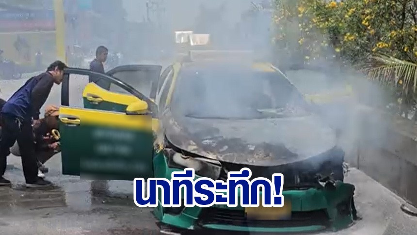 นาทีชีวิต! ไฟไหม้แท็กชี่ ผู้โดยสาร วิ่งหนีตาย-คนขับ บาดเจ็บ สาเหตุการเกิดเพลิงไหม้ยังไม่ทราบแน่ชัด