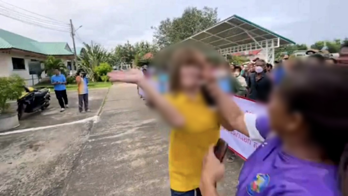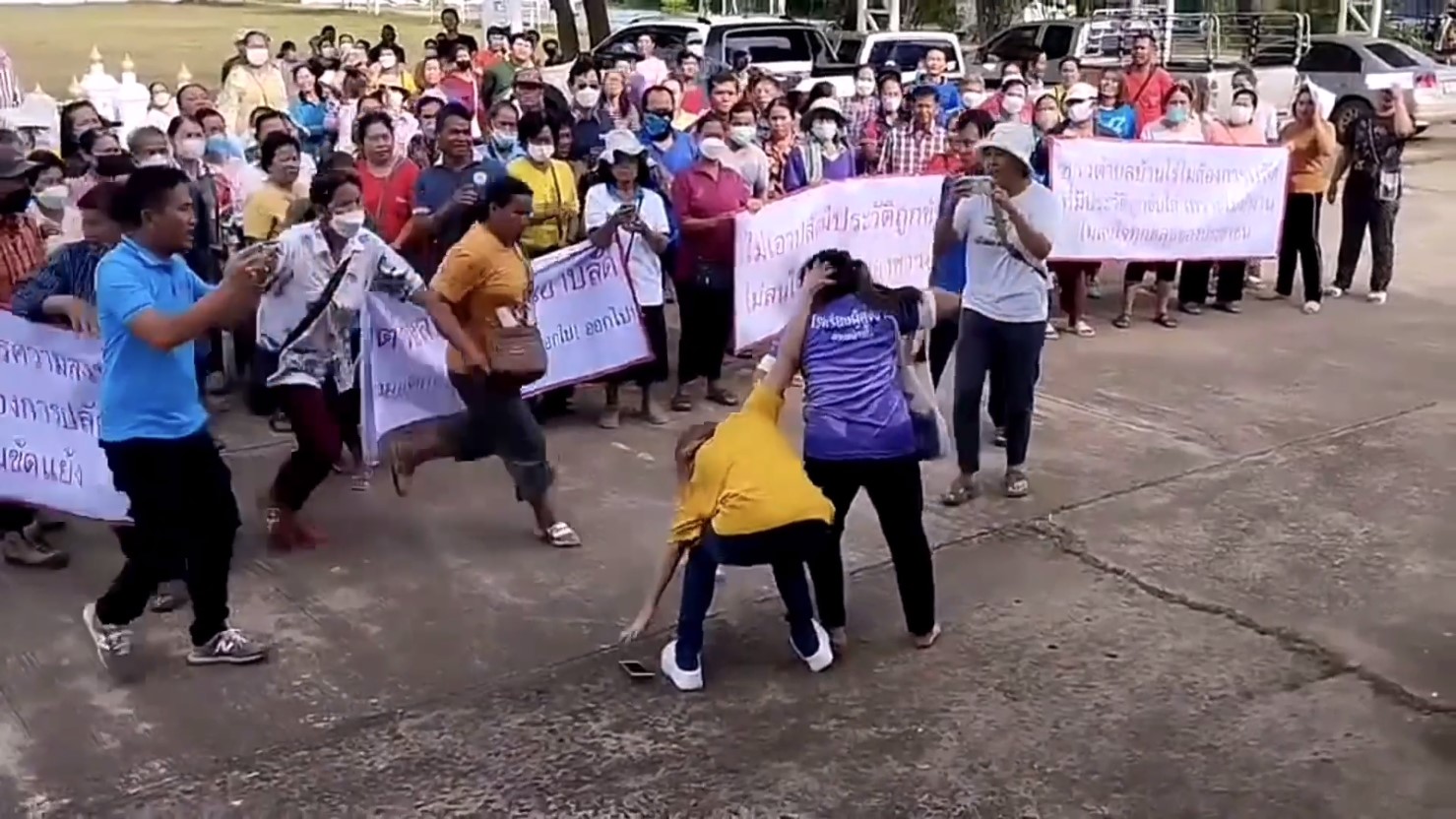 ชาวบ้านรวมตัวชูป้าย ขับไล่ปลัด อบต.บ้านไร่ เมียปลัดออกมาโต้แทน จนฟิวส์ขาด ง้างมือตบตีกับชาวบ้าน
