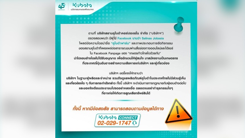 บริษัทฯ ในฐานะผู้ผลิตและจำหน่าย รวมถึงดูแลผลิตภัณฑ์คูโบต้าในประเทศไทยไม่มีส่วนรู้เห็นและเกี่ยวข้องใด ๆ กับการกระทำดังกล่าว โดยบริษัทฯ จะดำเนินการทางกฎหมายกับผู้แอบอ้างต่อไป และขอเตือนประชาชนโปรดอย่าหลงเชื่อและทำธุรกรรมใดๆ ที่อาจก่อให้เกิดการสูญเสียทรัพย์สินได้