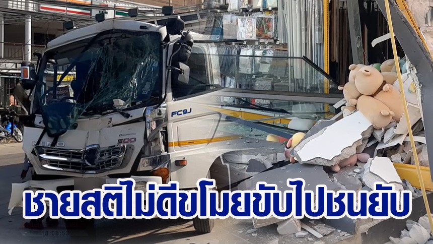 โชเฟอร์รถบรรทุกไปซื้อของ ไม่ดับเครื่อง ถูกชายสติไม่ดีขโมยขับ ชนร้านค้าพังยับ ชาวบ้านเจ็บ 1 ราย