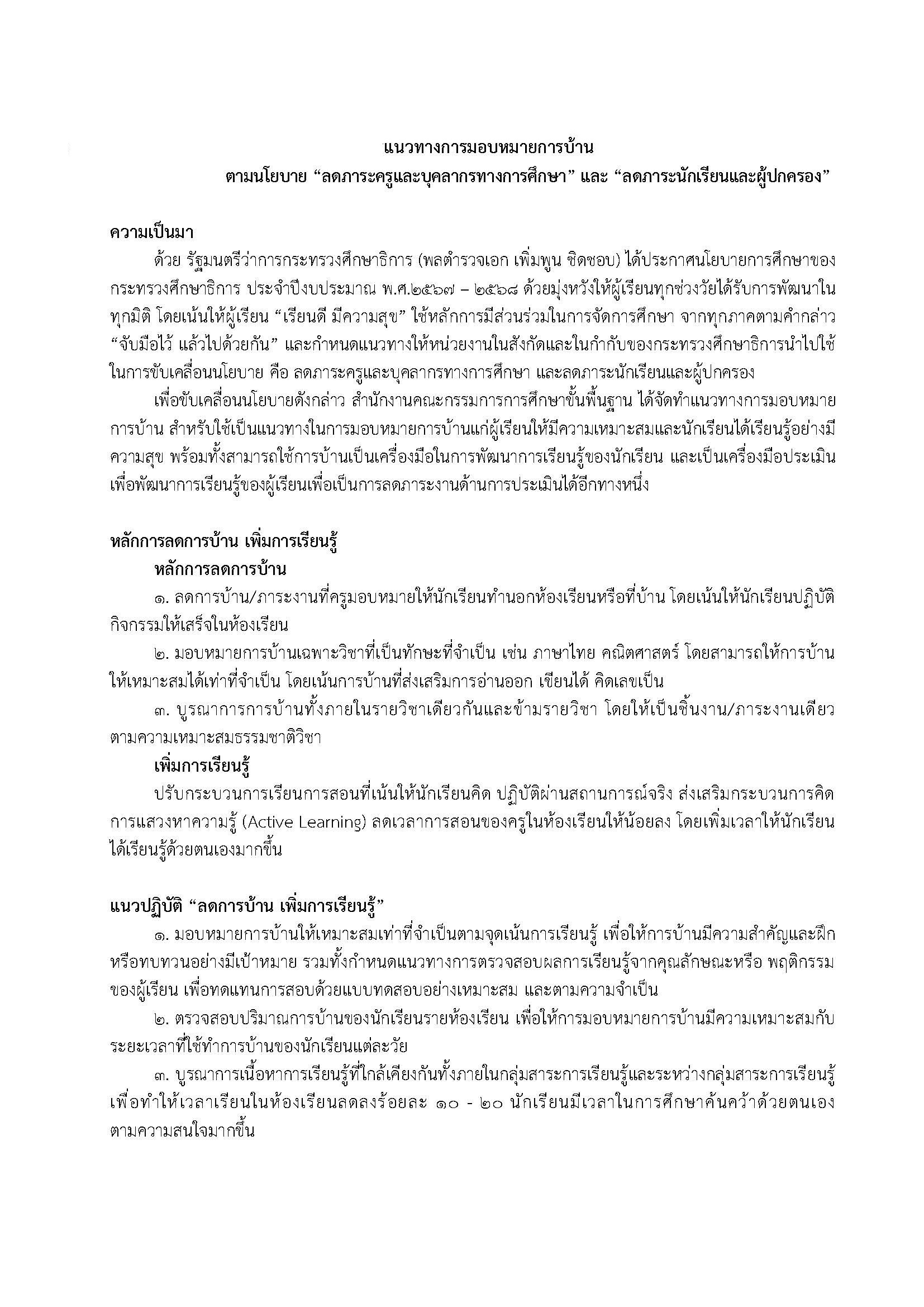 สำนักงานคณะกรรมการการศึกษาขั้นพื้นฐาน ได้ประกาศ “แนวทางการมอบหมายการบ้าน” ตามนโยบาย ลดภาระครูและบุคลากรทางการศึกษา และ ลดภาระนักเรียนและผู้ปกครอง ของรัฐมนตรีว่าการกระทรวงศึกษาธิการ (พลตำรวจเอก เพิ่มพูน ชิดชอบ) โดยเป็นการประกาศหลักการและแนวปฏิบัติในการมอบหมายการบ้าน “ลดการบ้าน เพิ่มการเรียนรู้” ที่มุ่งหวังให้นักเรียนได้เรียนรู้อย่างมีความสุข ให้การบ้านเป็นเครื่องมือในการพัฒนาการเรียนรู้และเป็นเครื่องมือประเมินเพื่อพัฒนาการเรียนรู้ของนักเรียน