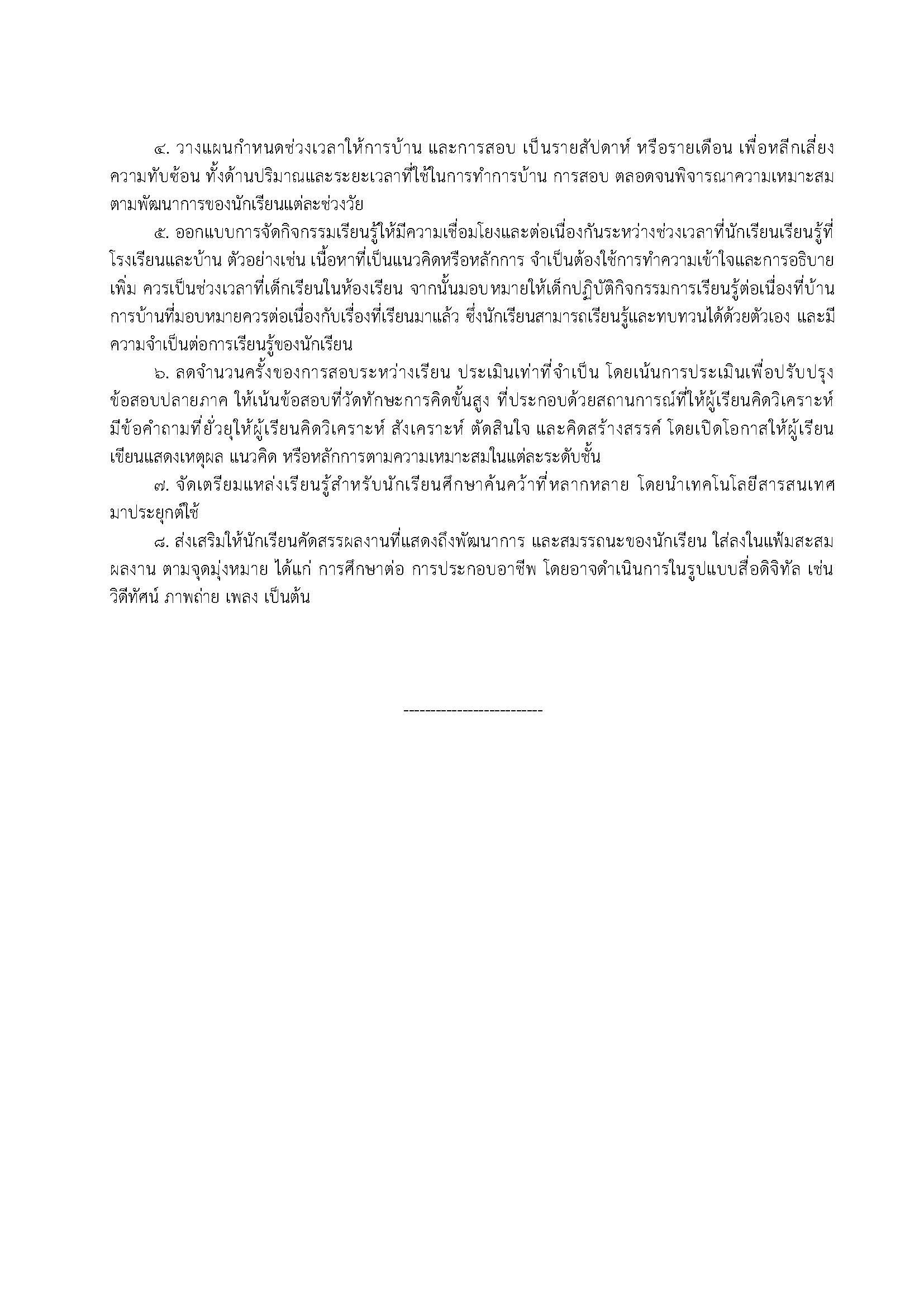 “การประกาศแนวทางการมอบหมายการบ้าน “ลดการบ้าน เพิ่มการเรียนรู้” ของ สพฐ. เพื่อให้คุณครู รวมถึงพ่อแม่ผู้ปกครองได้เข้าใจร่วมกันว่า หัวใจของการให้การบ้าน คือ การให้เด็กๆ ได้ทบทวนสิ่งที่ได้เรียนรู้ ให้ได้ฝึกฝนทำซ้ำจนเกิดทักษะ ซึ่งเด็กแต่ละคนต้องการเวลาเพื่อทำความเข้าใจสิ่งที่เรียนไม่เท่ากัน หรือสำหรับเด็กโต การบ้านที่ให้ได้ค้นคว้าอย่างอิสระ จะยิ่งส่งเสริมการเรียนรู้ ช่วยบ่มเพาะความรับผิดชอบในตนเอง