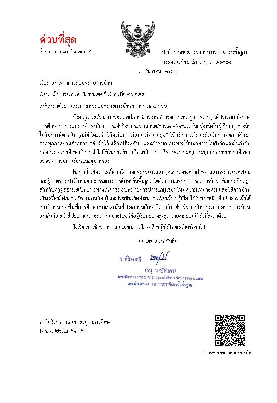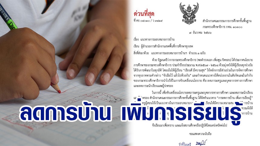 สพฐ.ประกาศแนวทาง 'ลดการบ้าน เพิ่มการเรียนรู้' มุ่งเน้นให้ผู้เรียน 'เรียนดี มีความสุข'