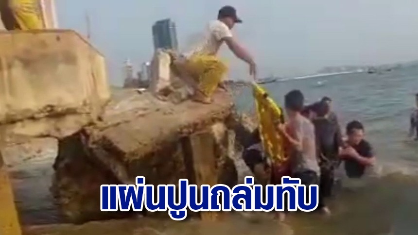 แผ่นปูนทับขาของผู้หญิง ส่วนผู้ชายได้รับบาดเจ็บเช่นกัน กู้ภัยพยายามช่วยคนเจ็บ ซึ่งเป็นผู้หญิงถูกแผ่นปูนทับ ใช้เวลาประมาณ 20 นาที ก็สามารถนำตัวขึ้นมายังฝั่งนำตัวส่งโรงพยาบาลมหาวิทยาลัยบูรพา