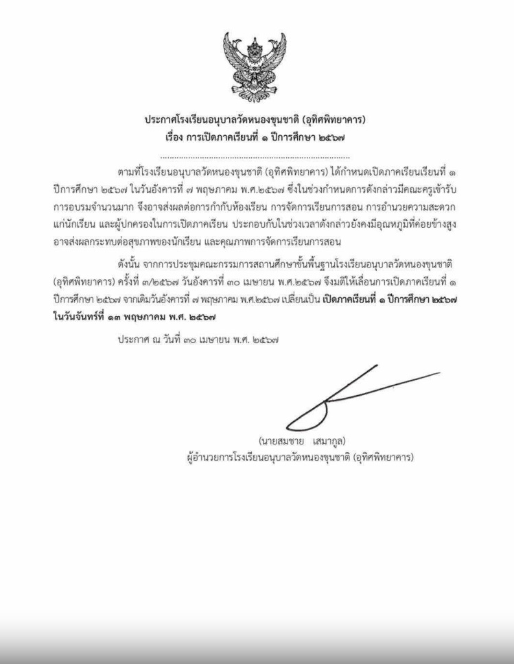 อากาศร้อนจัด รร.อนุบาลวัดหนองขุนชาติ (พิทยาคาร) ที่ จ.อุทัยธานี ประกาศเลื่อนเปิดเทอม เหตุสภาพอากาศร้อนจัด คณะครูไปอบรม และ หวั่นส่งผลกระทบต่อสุขภาพนักเรียน