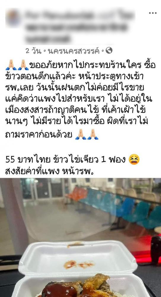 โดยเธอได้โพสต์ภาพพร้อมระบุข้อความว่า “ขออภัยหากไปกระทบร้านใคร ซื้อข้าวตอนดึกแล้วค่ะ หน้าประตูทางเข้า รพ. เลย วันนั้นฝนตก ไม่ค่อยมีไรขาย แค่คิดว่าแพงไปสำหรับเรา ไม่ได้อยู่ในเมือง สงสารถ้าญาติคนไข้ที่เขาเฝ้าไข้นานๆ ไม่มีรายได้ไรมาซื้อ ผิดที่เราไม่ถามราคาก่อนด้วย 55 บาทไทย ข้าวไข่เจียว 1 ฟอง สงสัยค่าที่แพง หน้า รพ.”