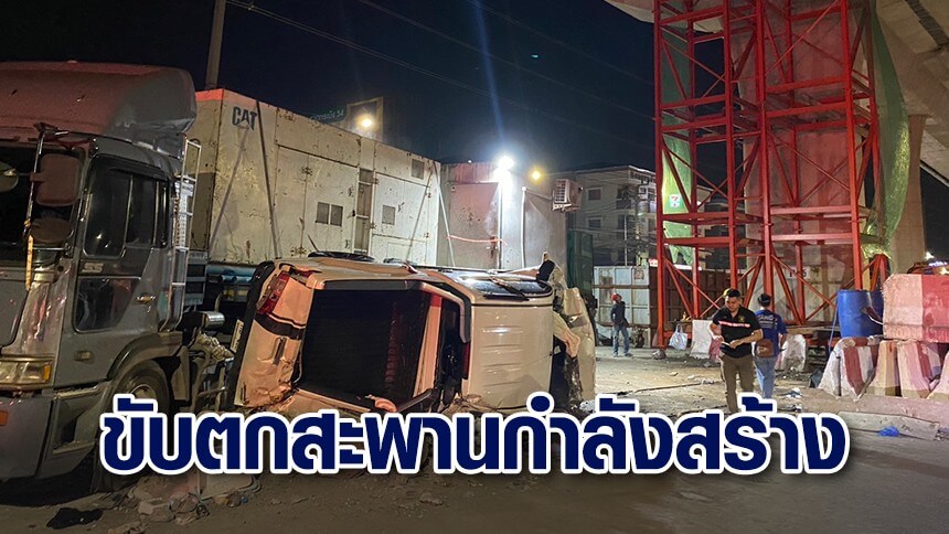 ไม่รู้ยังสร้างไม่เสร็จ! รถกระบะพุ่งตกสะพานยกระดับ กระแทกรถบรรทุกเจ็บ 3 คนขับชี้ไม่มีป้ายกั้น