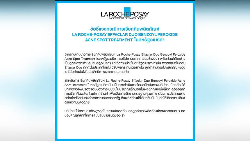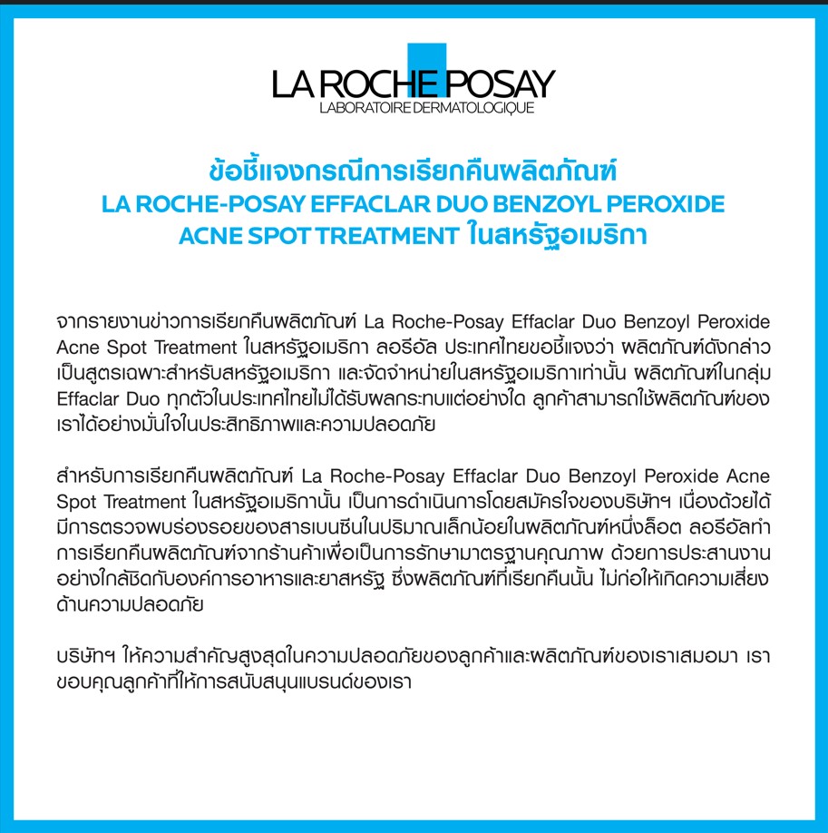 จากรายงานข่าวการเรียกคืนผลิตภัณฑ์ La Roche-Posay Effaclar Duo Benzoyl Peroxide Acne Spot Treatment ในสหรัฐอเมริกา ลอรีอัล ประเทศไทยขอชี้แจงว่า ผลิตภัณฑ์ดังกล่าวเป็นสูตรเฉพาะสำหรับสหรัฐอเมริกา และจัดจำหน่ายในสหรัฐอเมริกาเท่านั้น ผลิตภัณฑ์ในกลุ่ม Effaclar Duo ทุกตัวในประเทศไทยไม่ได้รับผลกระทบแต่อย่างใด ลูกค้าสามารถใช้ผลิตภัณฑ์ของเราได้อย่างมั่นใจในประสิทธิภาพและความปลอดภัย