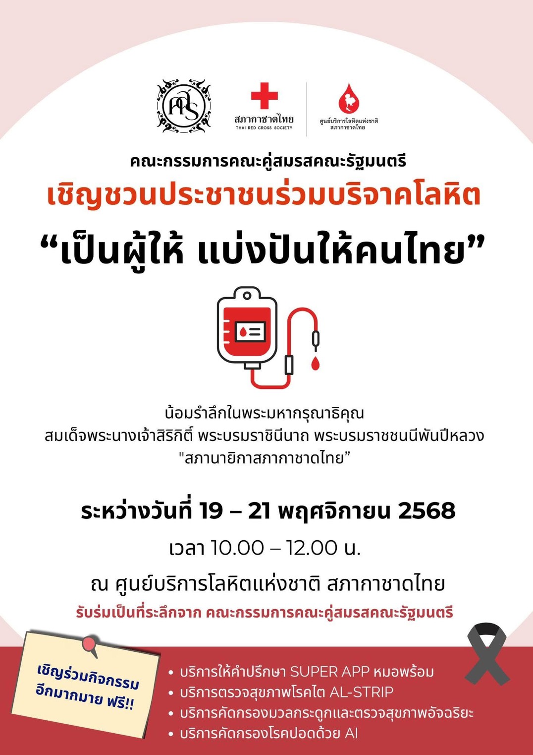 พร้อมเชิญชวน ประชาชนร่วมบริจาคโลหิต ณ ศูนย์บริการโลหิตแห่งชาติ สภากาชาดไทย ระหว่าง วันที่ 19–21 พฤศจิกายน เวลา 10.00–12.00 น.