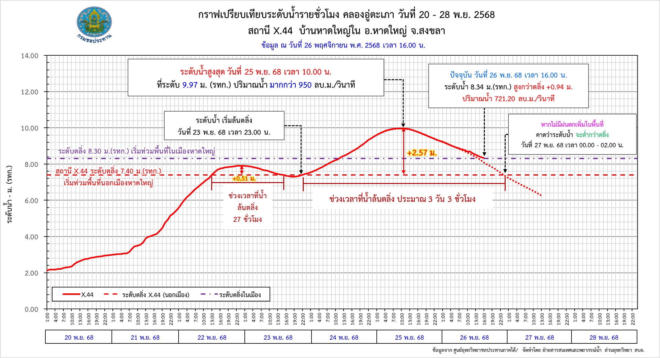 ทางด้าน ดร.ธเนศร์ สมบูรณ์ ผู้อำนวยการสำนักบริหารจัดการน้ำและอุทกวิทยา เปิดเผยว่า ระดับน้ำในคลองอู่ตะเภาที่ไหลผ่านเทศบาลนครหาดใหญ่ลดลงต่อเนื่อง โดยวานนี้ (25 พ.ย.68) ระดับน้ำสูงสุดเมื่อเวลา 10.00 น. จากนั้นได้ลดลงตามลำดับ จาก 9.97 ม. (รกท.) วัดเมื่อเวลา 16.00 น. วันนี้ (26 พ.ย.68) เหลือ 8.34 ม. รทก. สูงกว่าตลิ่ง +0.94 ม. คาดการณ์ว่ากลางดึกคืนนี้จะเข้าสู่ระดับตลิ่ง หากไม่มีฝนมาเพิ่ม สถานการณ์น้ำในอำเภอหาดใหญ่จะเข้าสู่ภาวะปกติในสัปดาห์นี้ ขณะที่ปริมาณน้ำในคลองร. 1 ซึ่งเป็นคลองระบายน้ำในระบบชลประทานไหลได้สะดวกขึ้น จะส่งผลให้น้ำที่ท่วมขังอยู่ทยอยลดลง