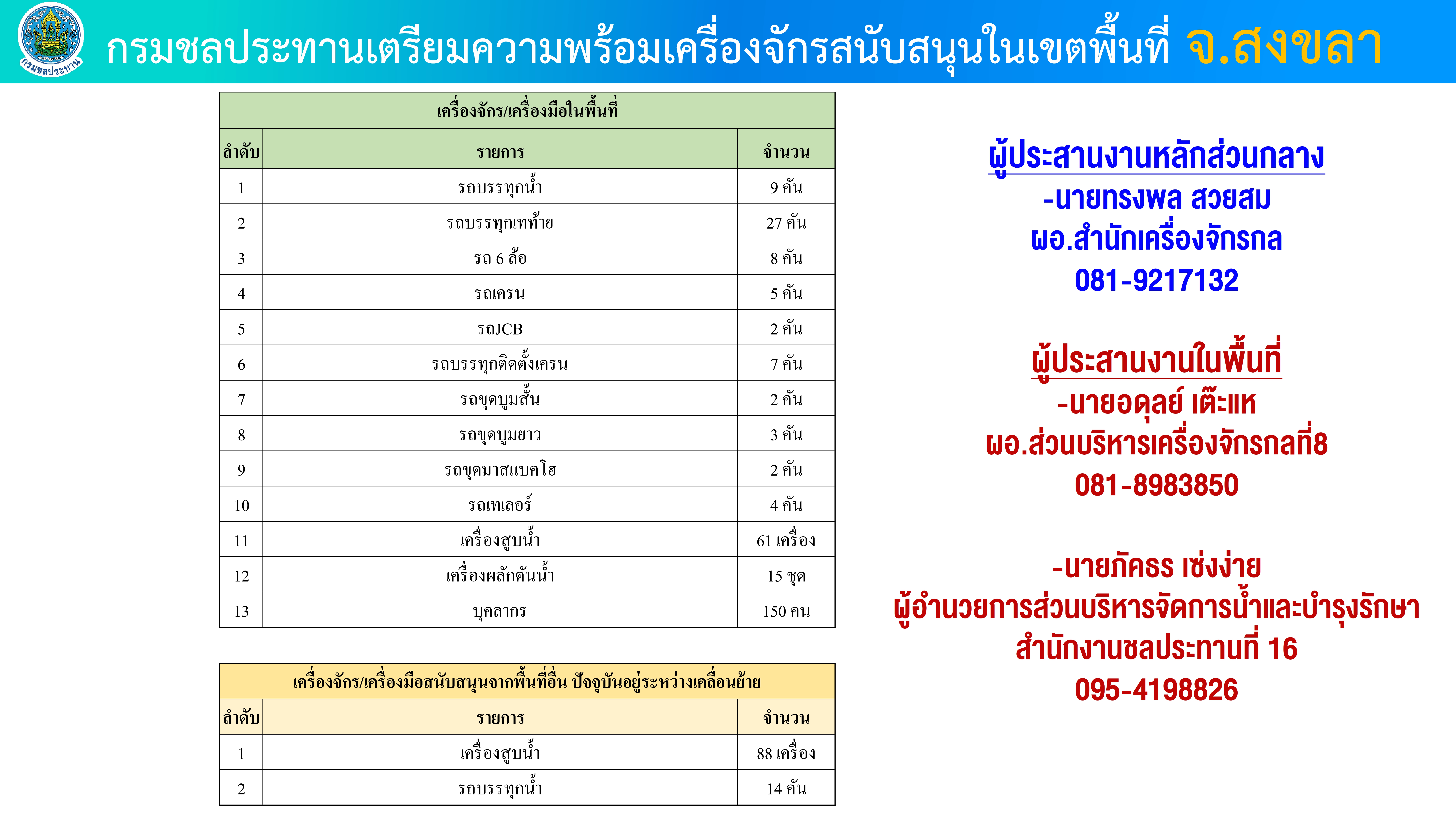 นายสุริยพล นุชอนงค์ อธิบดีกรมชลประทาน สั่งระดมกำลังเครื่องจักรกลลงพื้นที่เพื่อสนับสนุนการระบายน้ำออกจากพื้นที่ท่วมขังใน อำเภอหาดใหญ่ จังหวัดสงขลาอย่างต่อเนื่อง เพื่อเร่งคลี่คลายสถานการณ์และบรรเทาผลกระทบต่อประชาชนให้เร็วที่สุด ปัจจุบัน ได้ทยอยติดตั้งเครื่องสูบน้ำในหลายจุดแล้ว ขณะเดียวกัน พื้นที่ที่ยังมีระดับน้ำล้นตลิ่ง ได้เตรียมเครื่องจักรและกำลังเจ้าหน้าที่ สแตนด์บายพร้อมเข้าดำเนินการทันที เมื่อระดับน้ำลดลงเข้าสู่ลำน้ำ สามารถตั้งเครื่องได้อย่างปลอดภัย