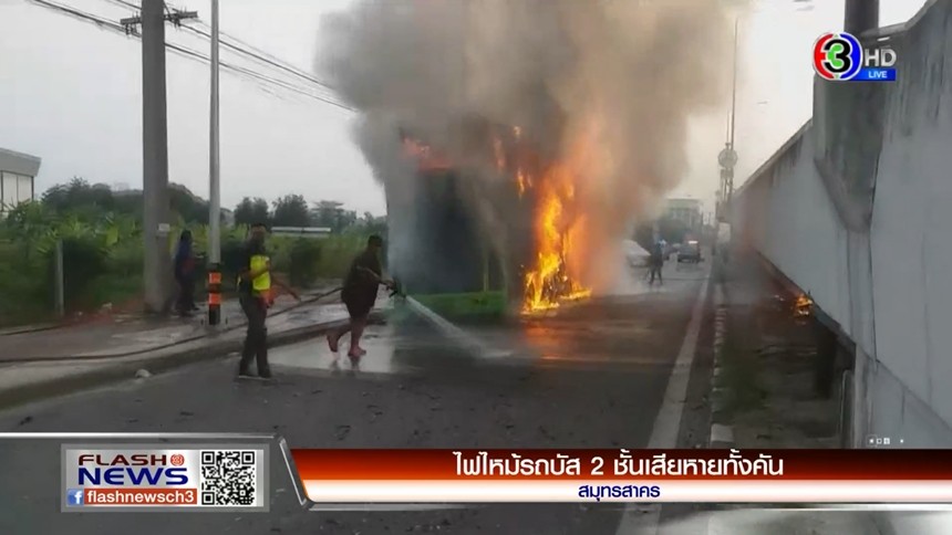 ไฟไหม้บัส 2 ชั้น ที่อ้อมน้อย ดับไฟร่วมครึ่งชม. เสียหายวอดทั้งคัน