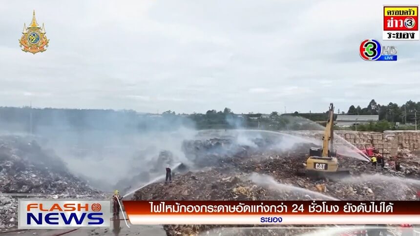 เหตุไฟไหม้กองกระดาษอัดแท่ง ภายในโรงงานผลิตกระดาษ ที่อำเภอบ้านค่าย จังหวัดระยอง ผ่านไปกว่า 24 ชั่วโมงแล้ว แต่ยังไม่สามารถดับไฟได้ ยังคงมีควันและเปลวไฟครุกรุ่นตลอดเวลา เจ้าหน้าที่ต้องใช้แบคโฮแขนยาว เกลี่ยกองกระดาษ และใช้น้ำฉีดเพื่อให้ไฟดับสนิท ขณะที่กลุ่มควัน เริ่มส่งผลกระทบต่อสุขภาพของชาวบ้าน ในชุมชนที่อยู่ท้ายลม