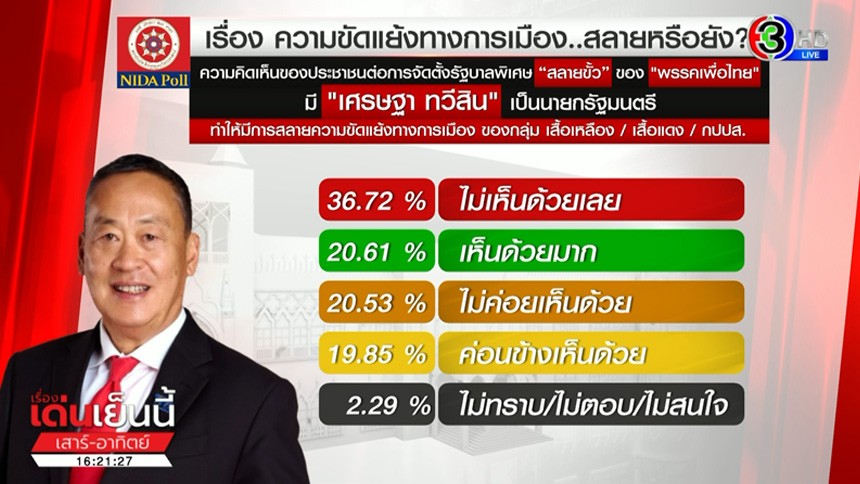 นิด้าโพล เผยผลสำรวจ ความขัดแย้งทางการเมือง ปชช.ไม่เชื่อ นายกฯเศรษฐา สลายขั้วสีเสื้อได้จริง