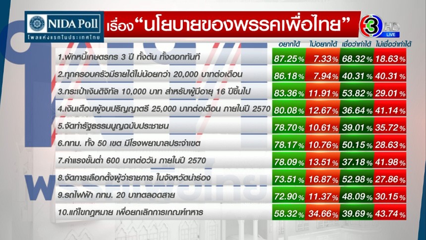 ในการสำรวจความเห็น นิด้าโพลสอบถามความเห็นประชาชนใน 2 หัวข้อ คือ นโยบายของพรรคเพื่อไทยที่ประชาชนอยากได้ และ นโยบายของรัฐบาลพรรคเพื่อไทยที่จะสามารถทำได้สำเร็จ พบว่า