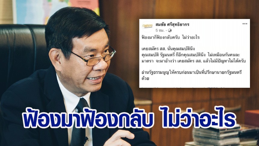 ขณะที่ อดีตกกต.สมชัย ได้โพสต์เฟซบุ๊กส่วนตัว โต้กลับทันที ระบุว่า "ฟ้องมาก็ฟ้องกลับครับ ไม่ว่าอะไร และก็บอกว่า เคยสมัคร สส.นั่นคุณสมบัตินึง // คุณสมบัติรัฐมนตรี ก็อีกคุรสมบัตินึง ไม่เหมือนกัน คนละมาตรา จะมาอ้างว่าเคยสมัคร สส.แล้วไม่มีปัญหาไม่ได้ พร้อมบอกให้ไปอ่านรัฐธรรมนูญให้ครบก่อนมาเป็นที่ปรึกษานายกรัฐมนตรีด้วย"