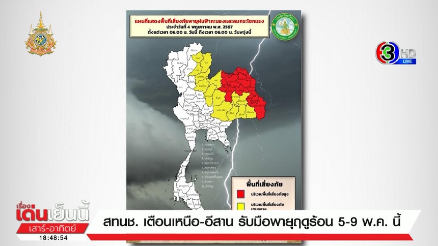 วันนี้ ทางกรมอุตุนิยมวิทยาได้ออกประกาศเตือนเรื่อง พายุฤดูร้อนบริเวณประเทศไทยตอนบน ฉบับที่ 7 ในช่วงวันที่ 4–5 พ.ค. 67 ที่ในพื้นที่ภาคเหนือ และภาคตะวันเฉียงเหนือ ได้รับลผกระทบ โดยบริเวณดังกล่าวมีพายุฝนฟ้าคะนอง ลมกระโชกแรง และลูกเห็บตกบางแห่ง รวมถึงอาจมีฟ้าผ่าเกิดขึ้นได้