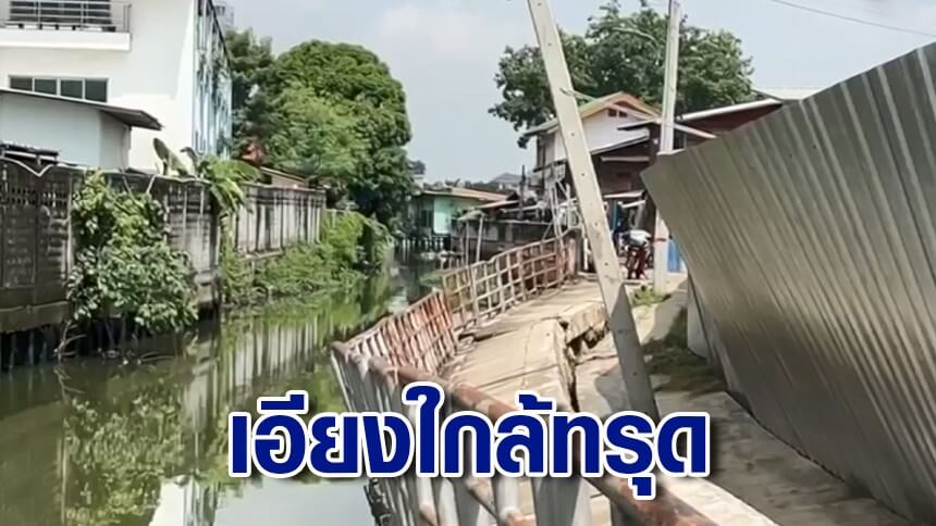 ชาวบ้านเดือดร้อนหนัก เขื่อนริมคลองทรุดเอียง เสาไฟใกล้ล้ม หวั่นอันตราย