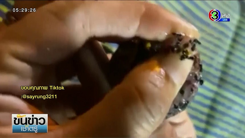 คุณฟ้า โพสต์คลิปลงแอพฯติ๊กต็อกชื่อว่า @sayrung3211 ซึ่งถ่ายไว้ วันที่ 24 ต.ค. หลังจากช่วยซื้อข้าวหลามถั่วดำ บริเวณริมชายหาดแห่งหนึ่ง พอจะแบ่งข้าวหลามถั่วดำกินกับน้องสะใภ้ ต้อง ผงะ! ชวนขนลุก เพราะถั่วดำที่เห็นในคลิปนั้น มันแถมมดดำติดเต็มข้าวหลามมาด้วย เหตุการณ์ในคลิปนี้เป็นอย่างไรไปชมกัน