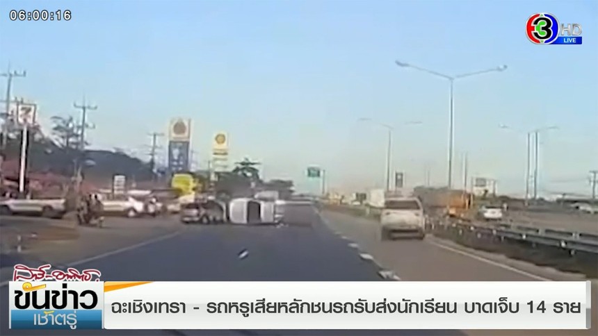 ระทึก! เก๋งมินิคูเปอร์ชนปอร์เช่ เสียหลักเสยกระบะรับส่ง นร.จนพลิกคว่ำ เด็กเจ็บ 14 ราย