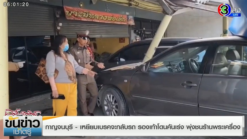 ที่ จ.กาญจนบุรี มีผู้หญิงขับรถมาจะเหยียบเบรกเพื่อกลับรถ แต่รองเท้าไปโดนคันเร่ง รถเลยพุ่งชนร้านพระเครื่องหลังคาพังยับ
